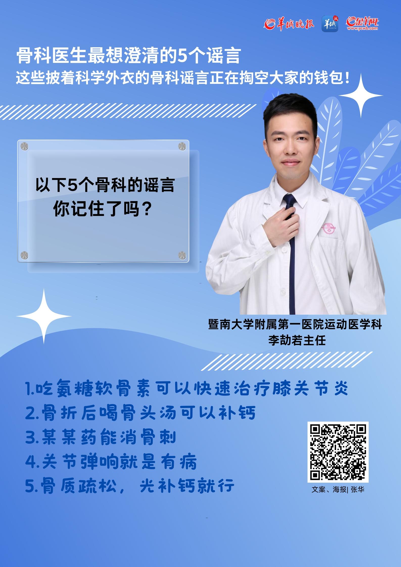 近日,暨南大学附属第一医院运动医学科主任李劼若在社交平台指出五个披着科学外衣、广为流传的骨科谣言,称它们不仅误导公众,更在无形中“掏空大家的钱包”。专家呼吁公众擦亮双眼,认清真相,避免健康与钱财的双重损失。