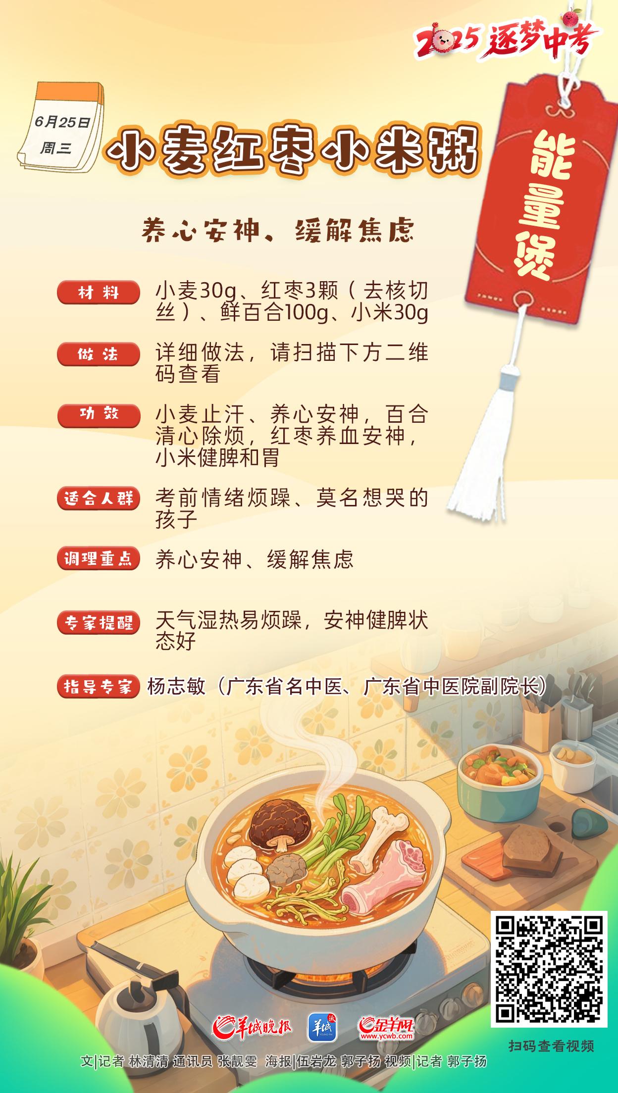 羊城晚报携手广东省中医院,推出中考“能量煲”,由广东省名中医、广东省中医院副院长杨志敏教授,给出每天一个调理加油建议,让名中医的养生能量药膳,助你一臂之力!