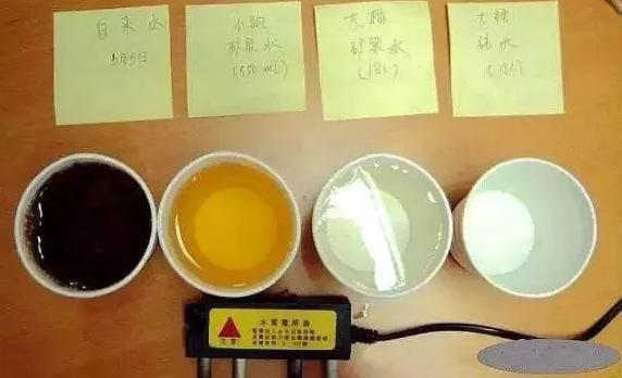 商家把测试仪放入两杯同样清澈的水中,经过几十秒的电解后,其中一杯过滤后的水呈无色,而另一杯中的自来水由黄色变绿色,最后表面浮有一层褐色的膜。