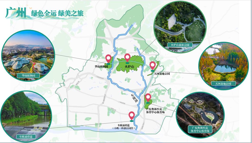该路线聚焦“观精彩全运,看美丽广东”主题,串联起国家植物园、森林公园、湿地公园、美丽河湖、全运美丽场馆等生态明珠,传承尊重自然、顺应自然、保护自然的生态价值观念,展示生态系统保护修复与可持续利用的生态智慧,倡导绿色低碳生产生活方式的生态文化,是天河区在建设美丽天河和推进“百千万工程”中打造的绿色典范。