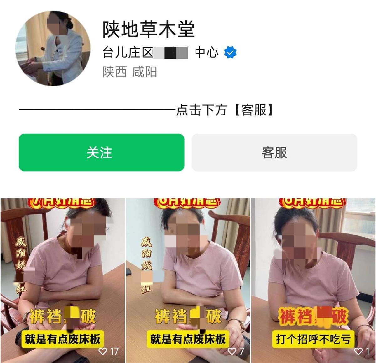 名为“陕地草木堂”的账号,归属地为咸阳,认证主体企业是枣庄台儿庄区某事业单位,发布了三个视频。视频中,一名女子在坐诊,标注“咸阳姚某红”,业务宣推、客服介绍等情况与上述账号相似。该账号客服对记者表示,这是她的账号,声称视频宣推的是咸阳秦都区九龙医院的业务,该医院主治男性性功能问题,自己是该医院职工。她未正面回应账号认证主体为何是台儿庄区某事业单位。