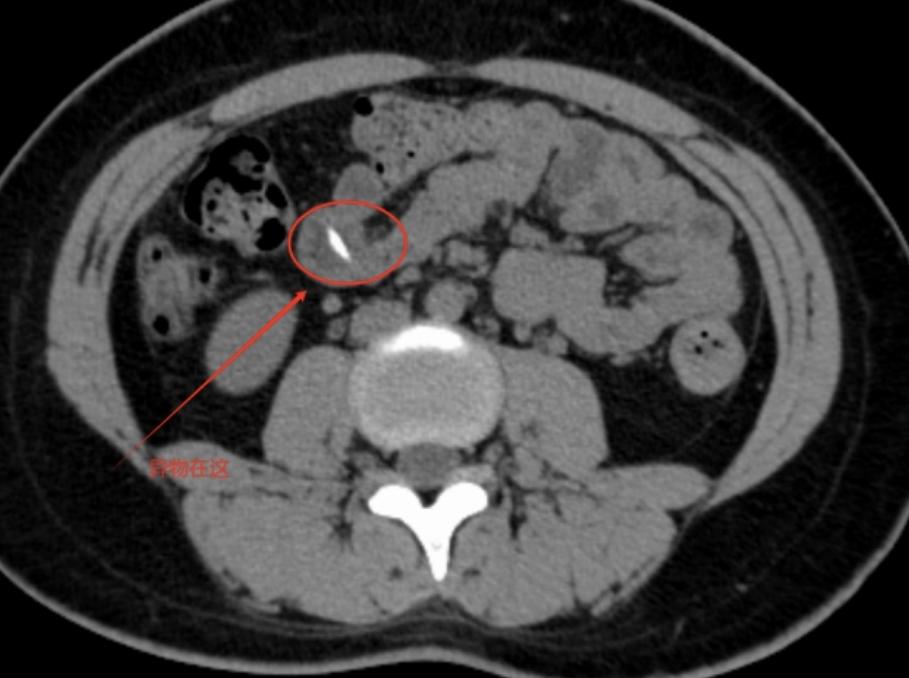 故事要从6天前那顿聚餐说起,家住番禺的小刘(化姓)一家人在外面吃饭,谁知隔天早上,她开始出现上腹隐痛,进食后疼痛加剧,虽休息可自行缓解,但上腹及脐周胀痛症状反复,6月21日,忍无可忍的她来到广东祈福医院普外中心门诊,张永祥副主任医师接诊,腹部CT检查发现:中腹小肠内高密度影,高度怀疑是消化道异物惹的祸,门诊拟“腹痛”收治入院。