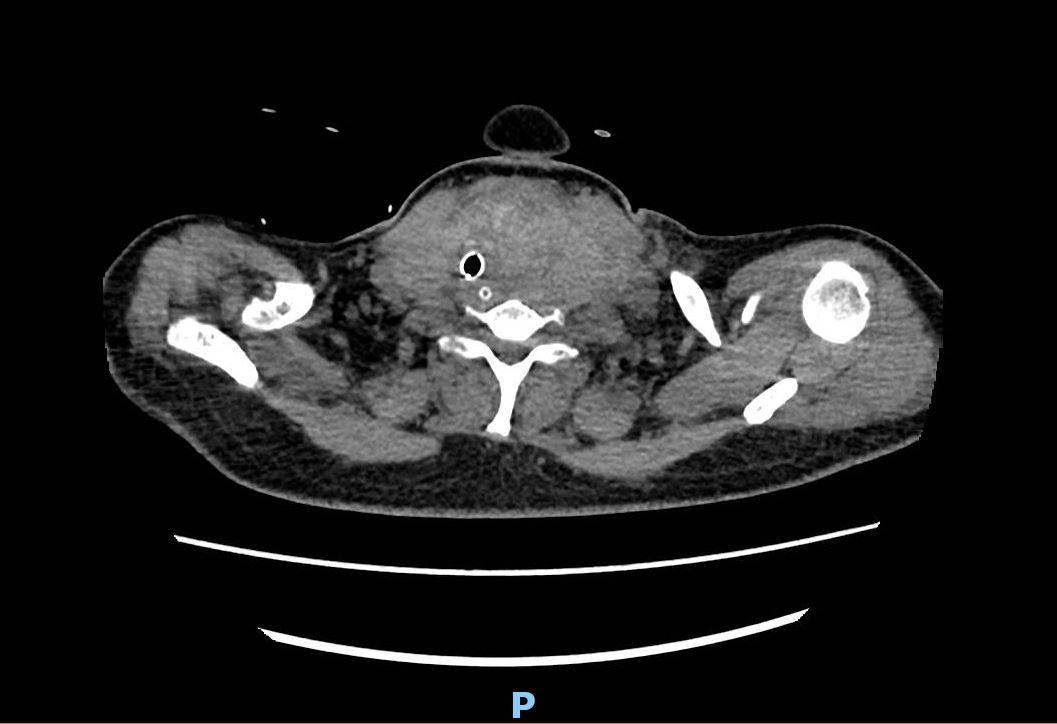王女士的颈部巨大甲状腺结节存在多年,体积远超成人拳头,形似“大苹果”。她自认“良性无害”,没有重视。殊不知结节长期压迫已导致气管严重软化狭窄。近期,王女士持续咳嗽咳痰两周,剧烈的胸腔震动使本就脆弱的气道不堪重负,如同“压垮骆驼的最后一根稻草”,气道塌陷加重,加之肺炎分泌物堵塞,她突然出现呼吸困难伴意识模糊。