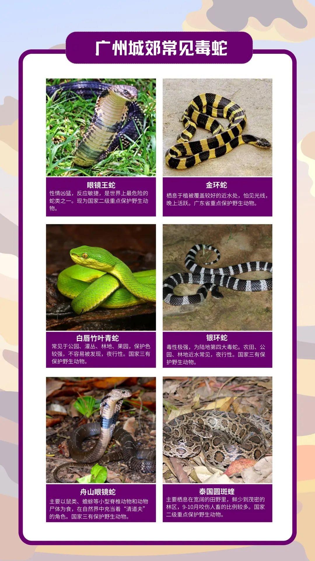 “蛇属于变温动物,一般在夏天比较活跃,出没于草丛、树林和河边。”广州市第一人民医院南沙医院急诊科副主任医师温健文说,广东的毒蛇有33种之多,常见有银环蛇(过基峡)、眼镜蛇(饭铲头)、眼镜王蛇(过山风)、竹叶青蛇、五步蛇等。