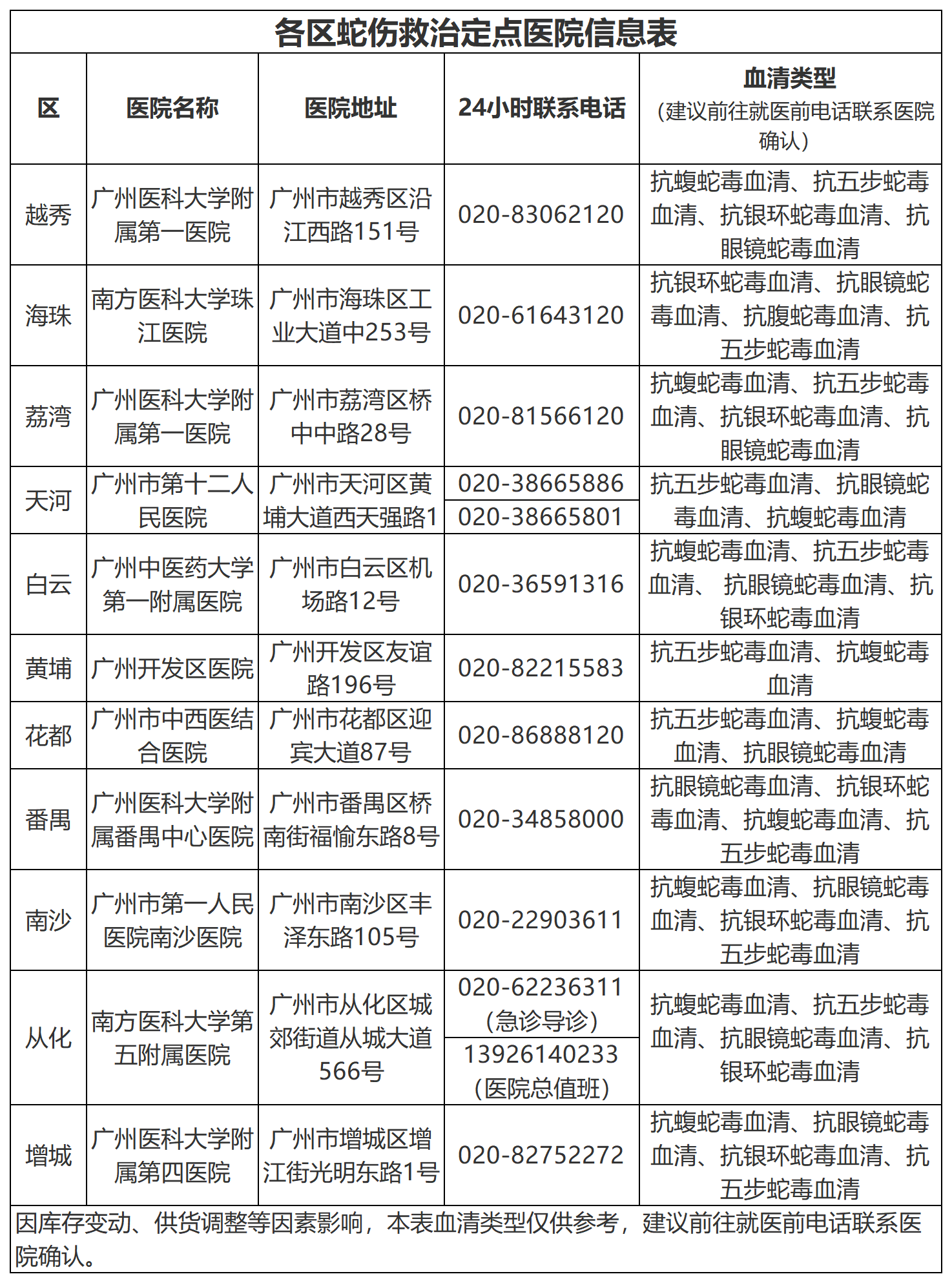 据广州市卫健委介绍,目前,每个区都有蛇伤定点医院,都备有足量的抗蛇毒血清,且血清可以医保报销。