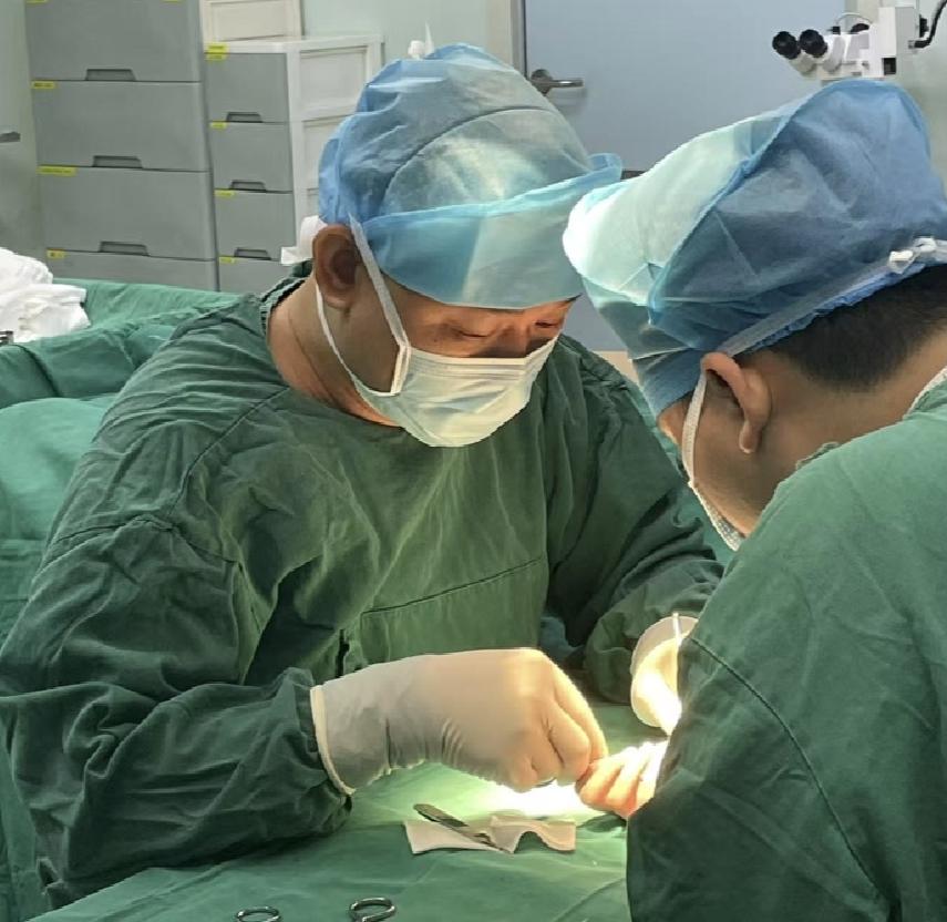 接诊的创伤显微外三科主任周洋检查发现,玲玲的左手多关节挛缩、左拇指屈曲畸形、手掌及虎口瘢痕挛缩、手指活动受限。随后,周洋主任团队为玲玲制定了详细的手术方案,包括:左拇指畸形矫正、虎口及拇指瘢痕挛缩松解整形、虎口开大成形、阔筋膜移植稳定关节、肌腱延长移植,以及游离皮瓣修复左拇指与虎口等。其中,团队采用“股前外侧削薄皮瓣”技术,从右大腿切取皮瓣移植至左手,同时移植皮神经和血管,精准修复拇指功能与外观。