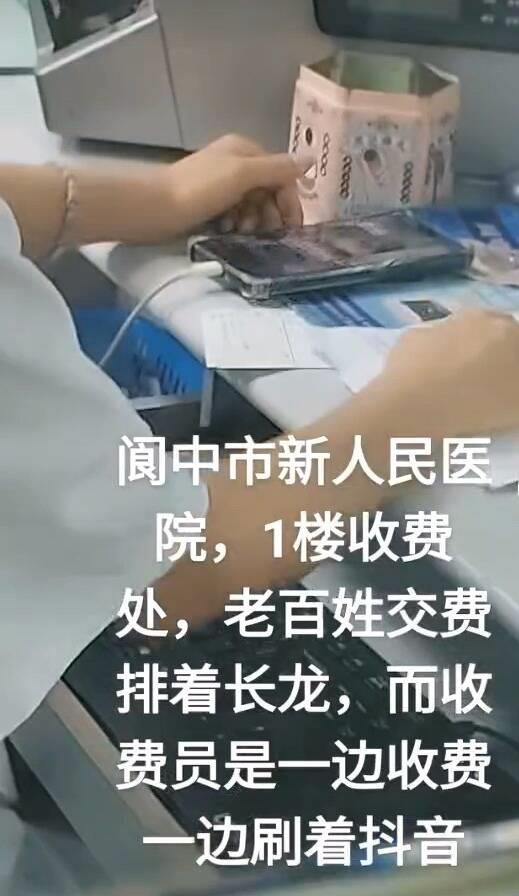 7月7日,有网友发视频称,四川南充阆中市人民医院收费窗口处,一名工作人员在岗位上边工作边用手机刷短视频。