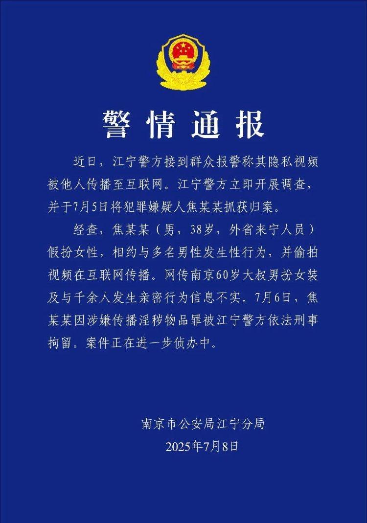 7月8日,南京江宁警方发布通报称,焦某某(男,38岁,外省来宁人员)假扮女性,相约与多名男性发生性行为,并偷拍视频在互联网传播。网传南京60岁大叔男扮女装及与千余人发生亲密行为信息不实。目前,焦某某因涉嫌传播淫秽物品罪被江宁警方依法刑事拘留。案件正在进一步侦办中。