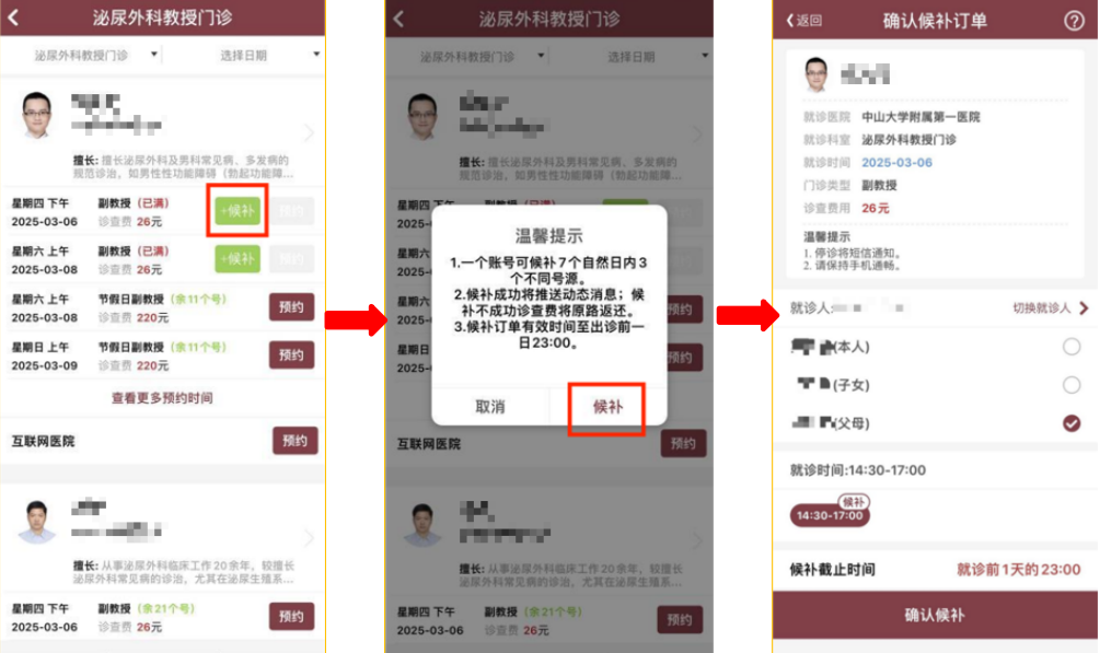 4. 合理利用候补规则:如中山一院规定一个账号可候补7个自然日内的3个不同专家号源。候补时,可挂同一专科的不同专家,以增加候补成功率。