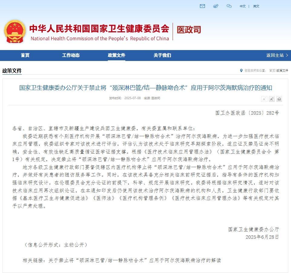 我委近期获悉有个别医疗机构开展“颈深淋巴管/结—静脉吻合术”治疗阿尔茨海默病,为进一步加强医疗技术临床应用管理,我委组织专家对该技术进行评估,评估认为该技术处于临床研究早期探索阶段,适应证及禁忌证尚不明确,安全性、有效性缺乏高质量循证医学证据支撑。根据《医疗技术临床应用管理办法》(国家卫生健康委员会令第1号)有关规定,决定禁止将“颈深淋巴管/结—静脉吻合术”应用于阿尔茨海默病治疗。