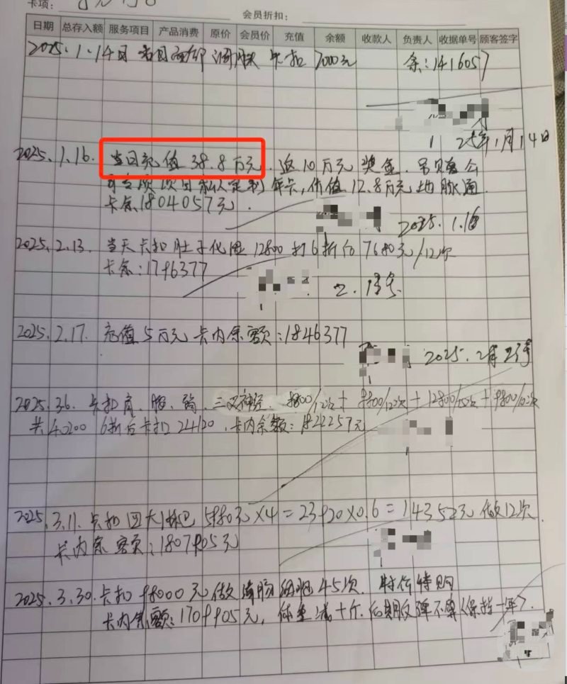 程先生提供的消费凭证显示,仅2025年1月16日就充值38.8万元,到2025年3月30日卡内余额170多万元。他做的项目包括清肠、按摩和针刺排毒。
