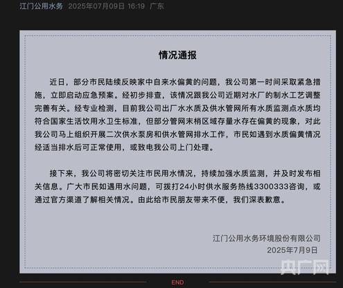 通报指出,近日,部分市民陆续反映家中自来水偏黄的问题,公司第一时间采取紧急措施,立即启动应急预案。经初步排查,该情况跟公司近期对水厂的制水工艺调整完善有关。经专业检测,目前公司出厂水水质及供水管网所有水质监测点水质均符合国家生活饮用水卫生标准,但部分管网末梢区域存量水存在偏黄的现象。对此,公司马上组织开展二次供水泵房和供水管网排水工作。市民如遇到水质偏黄情况经适当排水后可正常使用,或致电公司上门处理。接下来,公司将密切关注市民用水情况,持续加强水质监测,并及时发布相关信息。