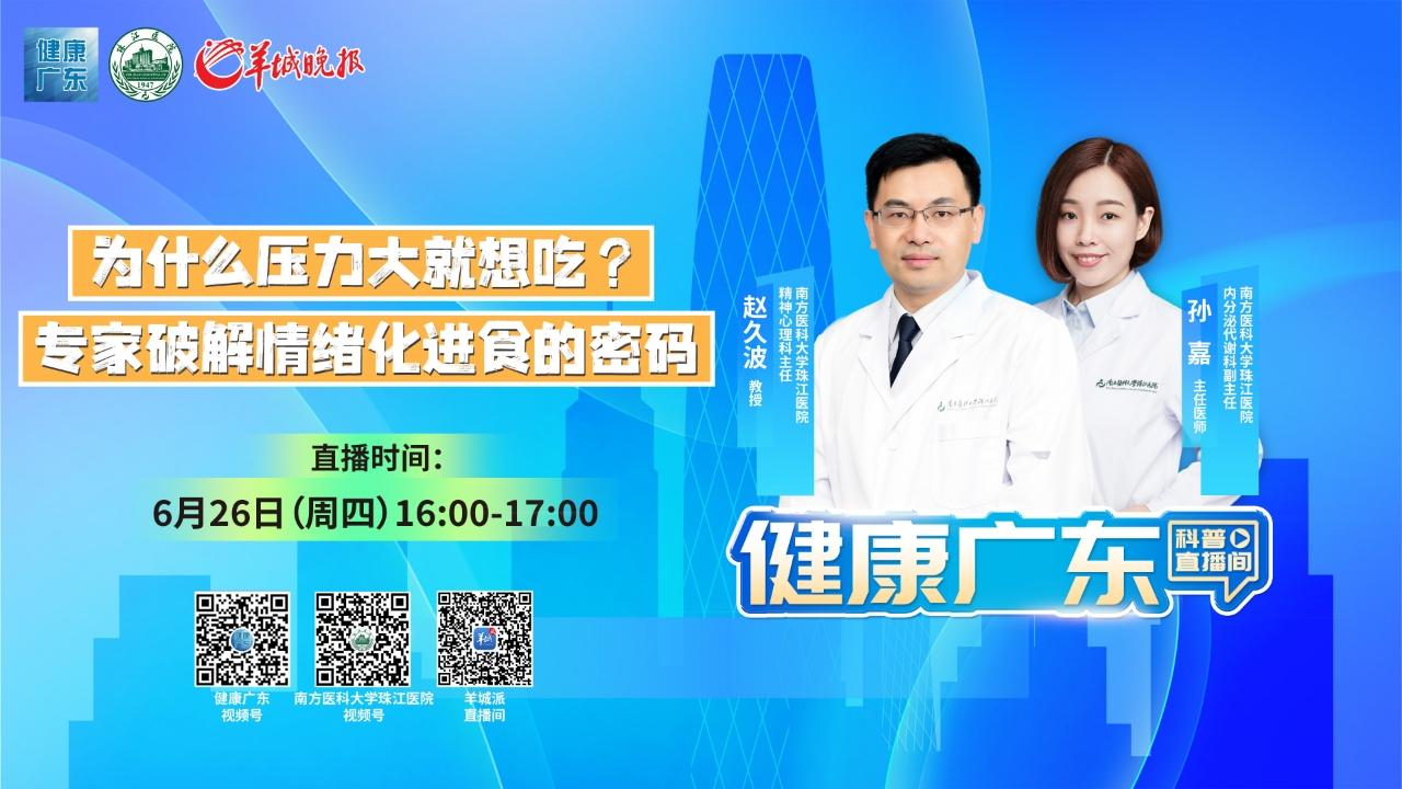 6月26日,南方医科大学珠江医院内分泌代谢科副主任孙嘉、精神心理科负责人赵久波教授做客直播间,聚焦的话题为“情绪化进食应对指南”,一起了解暴食症干预、正念饮食训练等话题。从医学和心理学的双角度为大家揭开谜团。