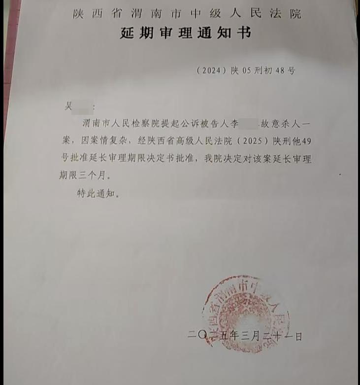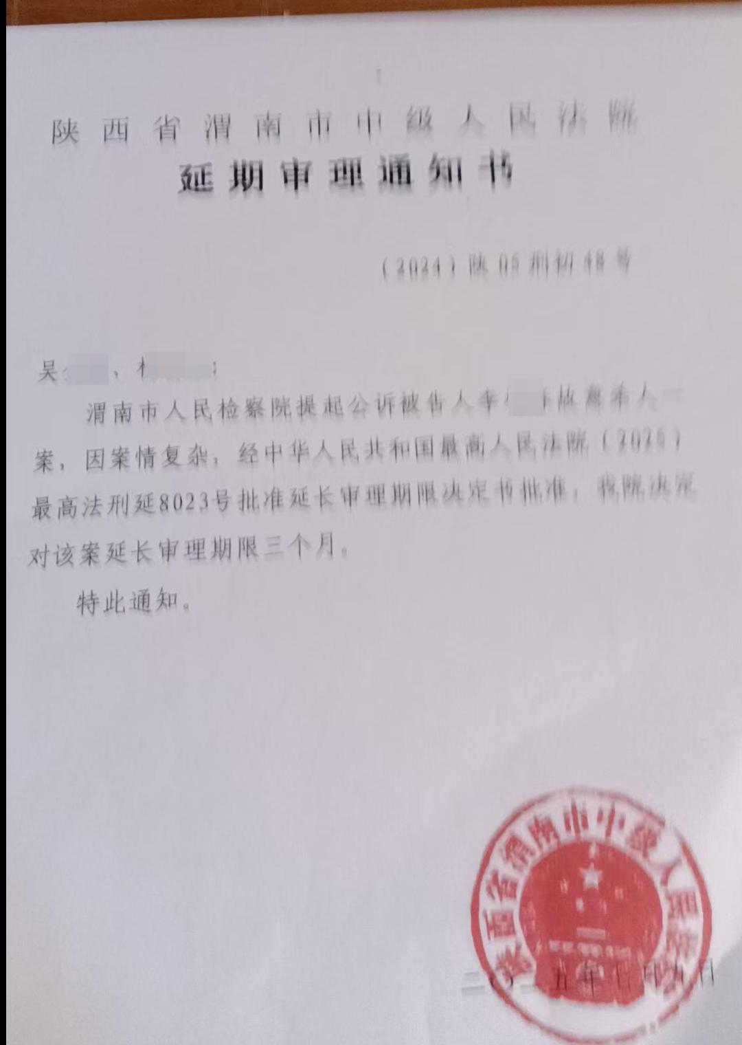 7月11日,记者从吴某某家属处获悉,他们于9日收到陕西省渭南市中级人民法院延期审理通知书。通知书显示:因案情复杂,经中华人民共和国最高人民法院(2025)最高法刑延8023号批准延长审理期限决定书批准,对该案延长审理期限三个月。
