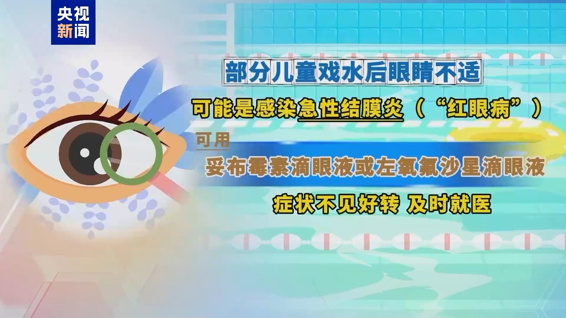 还有部分儿童戏水后眼睛不适,可能是感染了急性结膜炎,也就是“红眼病”,可用妥布霉素滴眼液,或左氧氟沙星滴眼液,如果症状不见好转,及时就医。