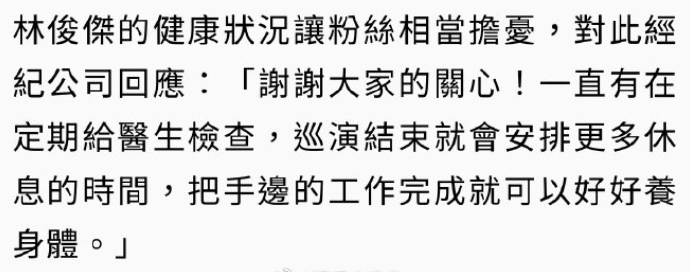 7月14日,针对心脏出问题的消息,林俊杰经纪公司最新回应:“谢谢大家的关心!一直有在定期给医生检查,巡演结束就会安排更多休息的时间,把手边的工作完成就可以好好养身体。”