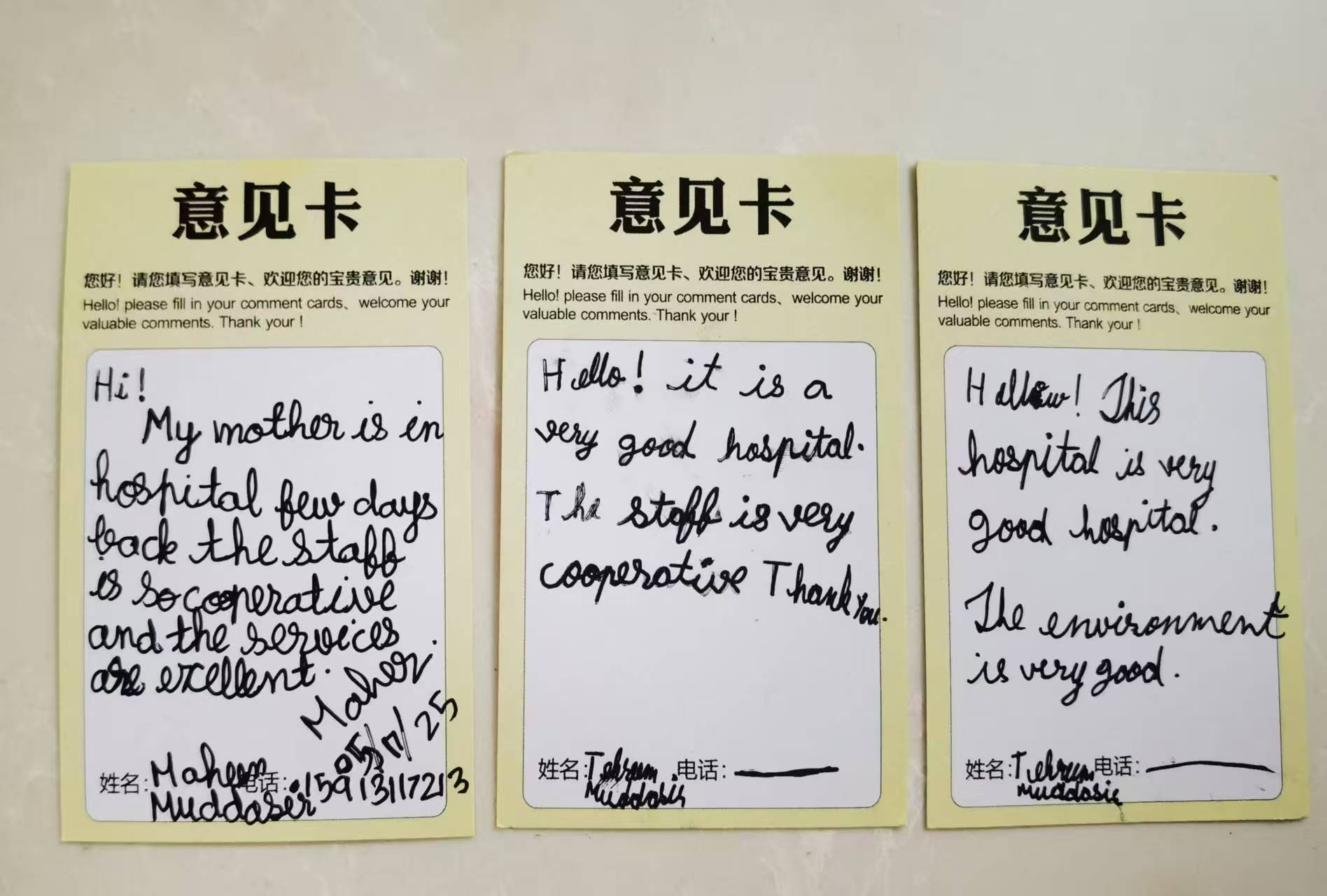 法蒂玛出院时,留给医院的三张意见卡上写着:“服务很棒”“环境极好”“像家人一样”(翻译)的评价。出院那天,当法蒂玛拄着拐杖站起来时,她用刚学会的中文反复说着“谢谢中国”。