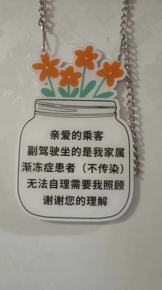 为了消除误解,女儿专门制作了一张提示卡挂在车内:亲爱的乘客:副驾驶坐的是我家属,渐冻症患者(不传染),无法自理需要我照顾。谢谢您的理解。