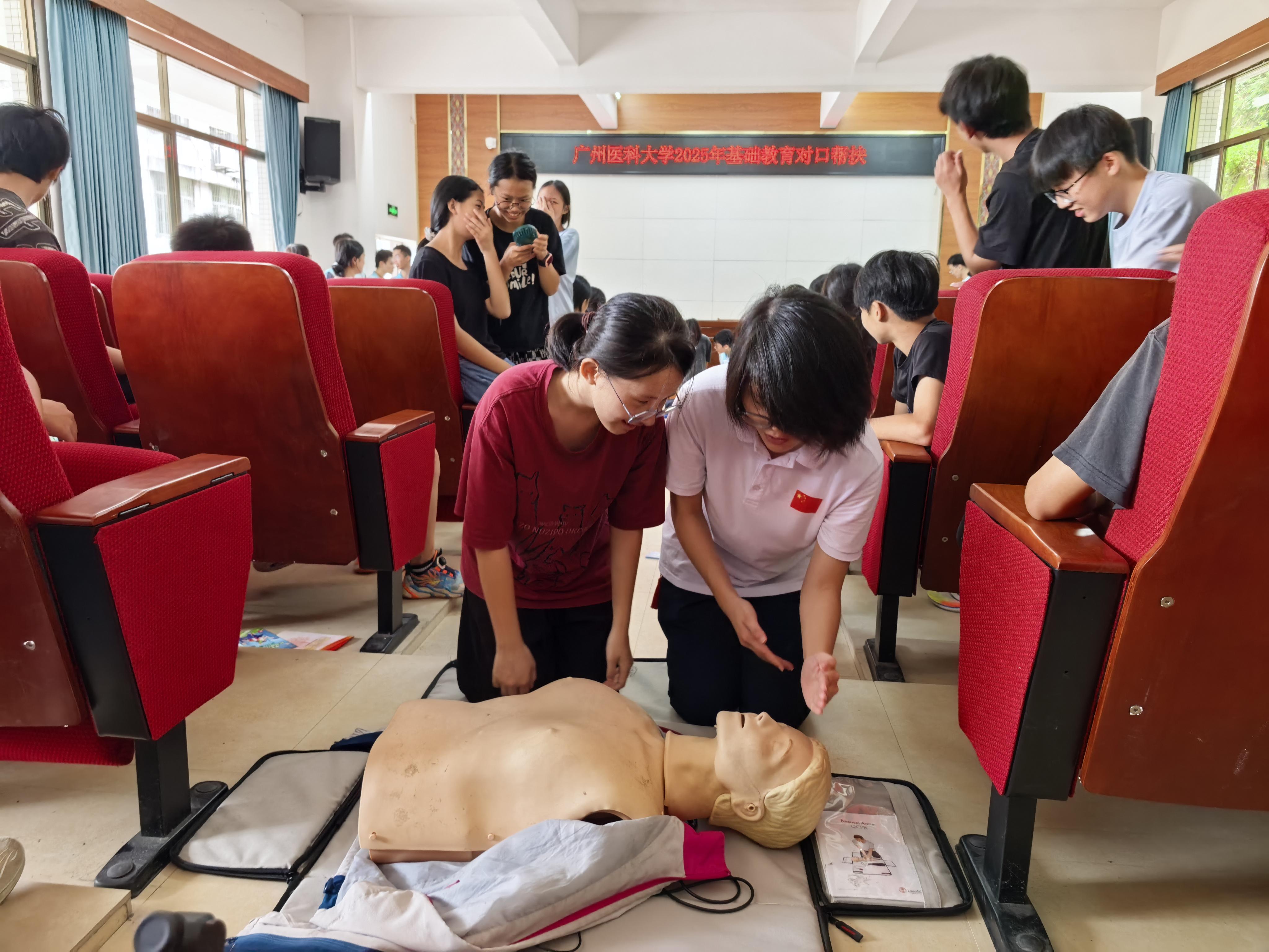 “按压深度需达5-6厘米、频率保持每分钟100-120次。”连山壮族瑶族自治县永和镇永和中学的课堂上,广医学生志愿者化身“急救教官”,边演示心肺复苏(CPR)的标准动作,边向学生们讲解操作要点,带领学生掌握挽救生命的重要技能。
