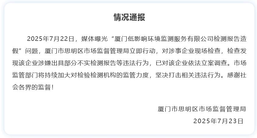 2025年7月22日,媒体曝光“厦门低影响环境监测服务有限公司检测报告造假”问题,厦门市思明区市场监督管理局立即行动,对涉事企业现场检查,检查发现该企业涉嫌出具部分不实检测报告等违法行为,已对该企业依法立案调查。市场监管部门将持续加大对检验检测机构的监管力度,坚决打击相关违法行为。感谢社会各界的监督!