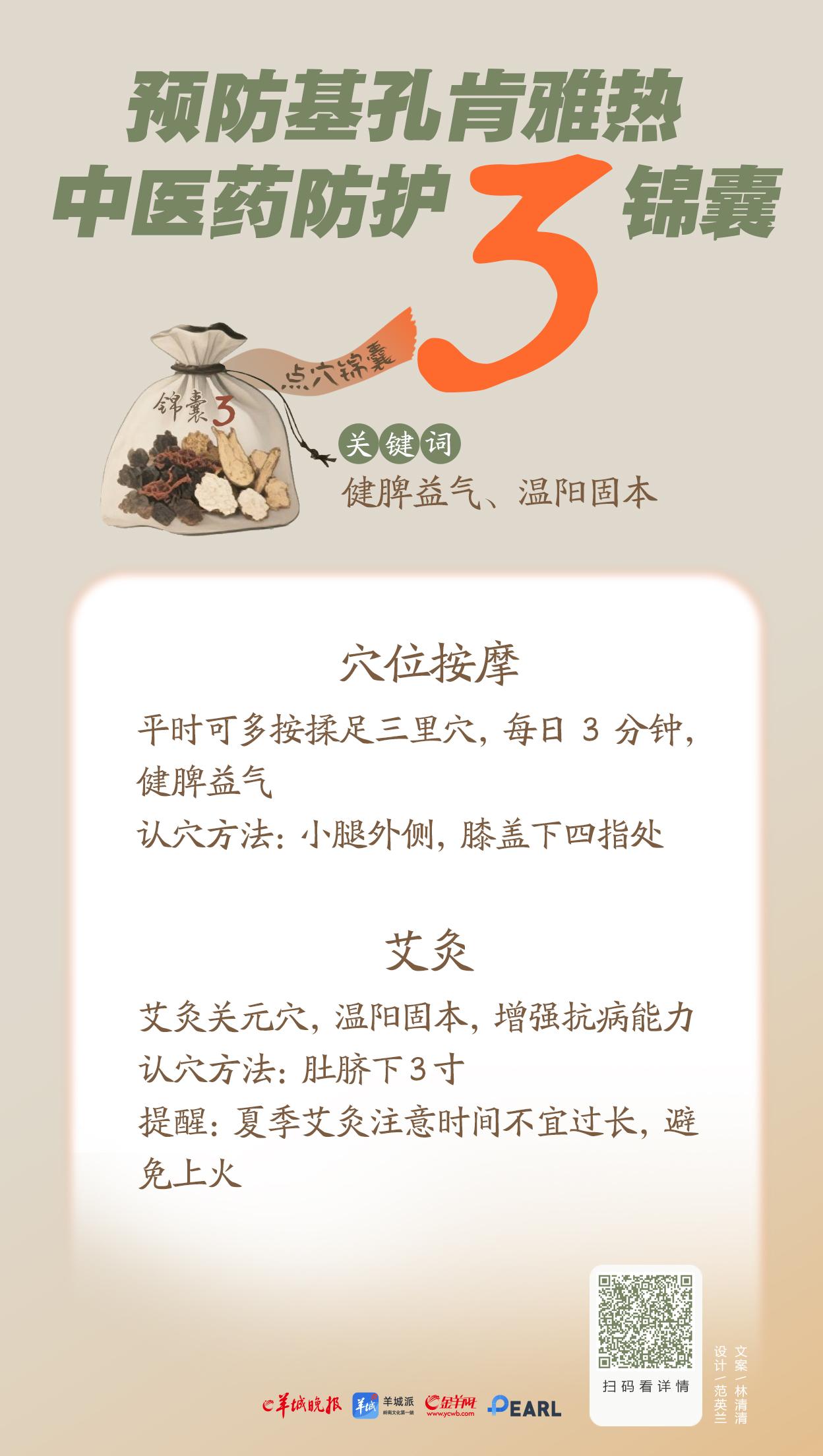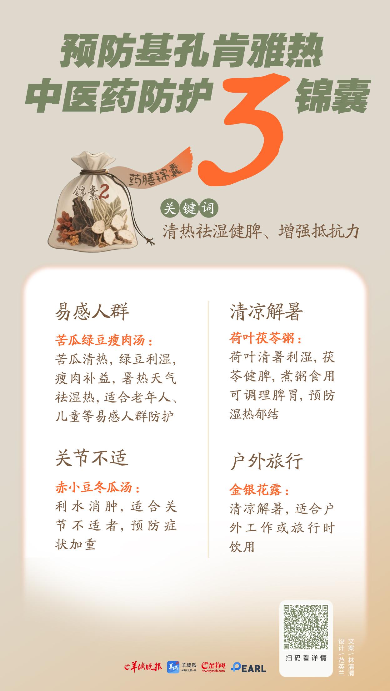 中医药防护,有何锦囊妙招?广州中医药大学第三附属医院中医全科医学科(中医经典科)主任黄平东表示,夏季高温潮湿,蚊虫滋生快,是各种疾病高发期。预防关键记住三句话:防蚊虫、清环境、强体质。日常药膳调理,可从清热祛湿、增强抵抗力的方向进行预防。若不慎中招,有关节疼痛等症状,也可以相应对症治疗,缓解症状。黄平东总结了3个防护锦囊,送给市民防身!