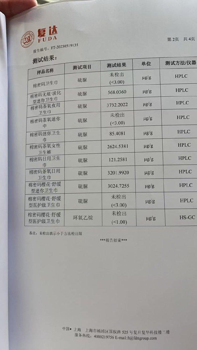 今年5月,王先生在自媒体上曝光“棉密码”卫生巾添加硫脲,并组织消费者集体送检。上海复达检测技术集团有限公司出具的检测结果显示,10份样品中有7份检出硫脲,其中棉密码茶氧夜用卫生巾、棉密码茶氧日用卫生巾、棉密码樱花·舒缓型迷你卫生巾的硫脲含量分别高达3732.2022μg/g、3201.9902μg/g、3204.7255μg/g。