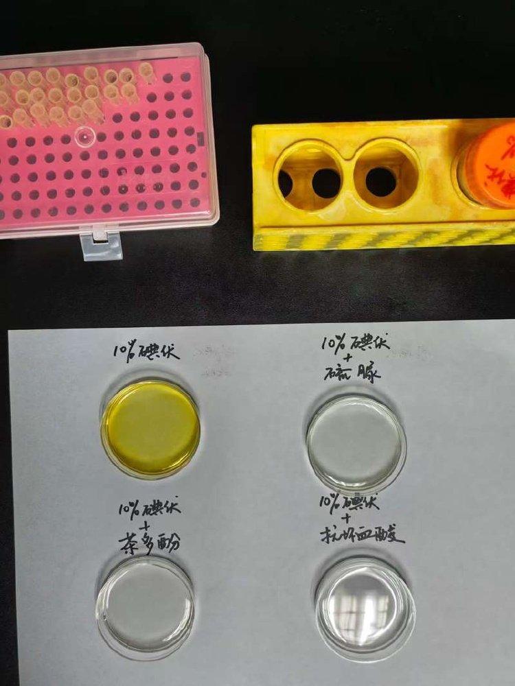 前述专家解释说,茶多酚和维生素C都是抗氧化剂,能使碘伏溶液脱色变清澈。在相同浓度下,市售茶多酚也能使碘伏溶液脱色,但反应后溶液呈现为乳白色悬浊液,这是因为茶多酚氧化后产物的水溶性较差,在水中析出所致。