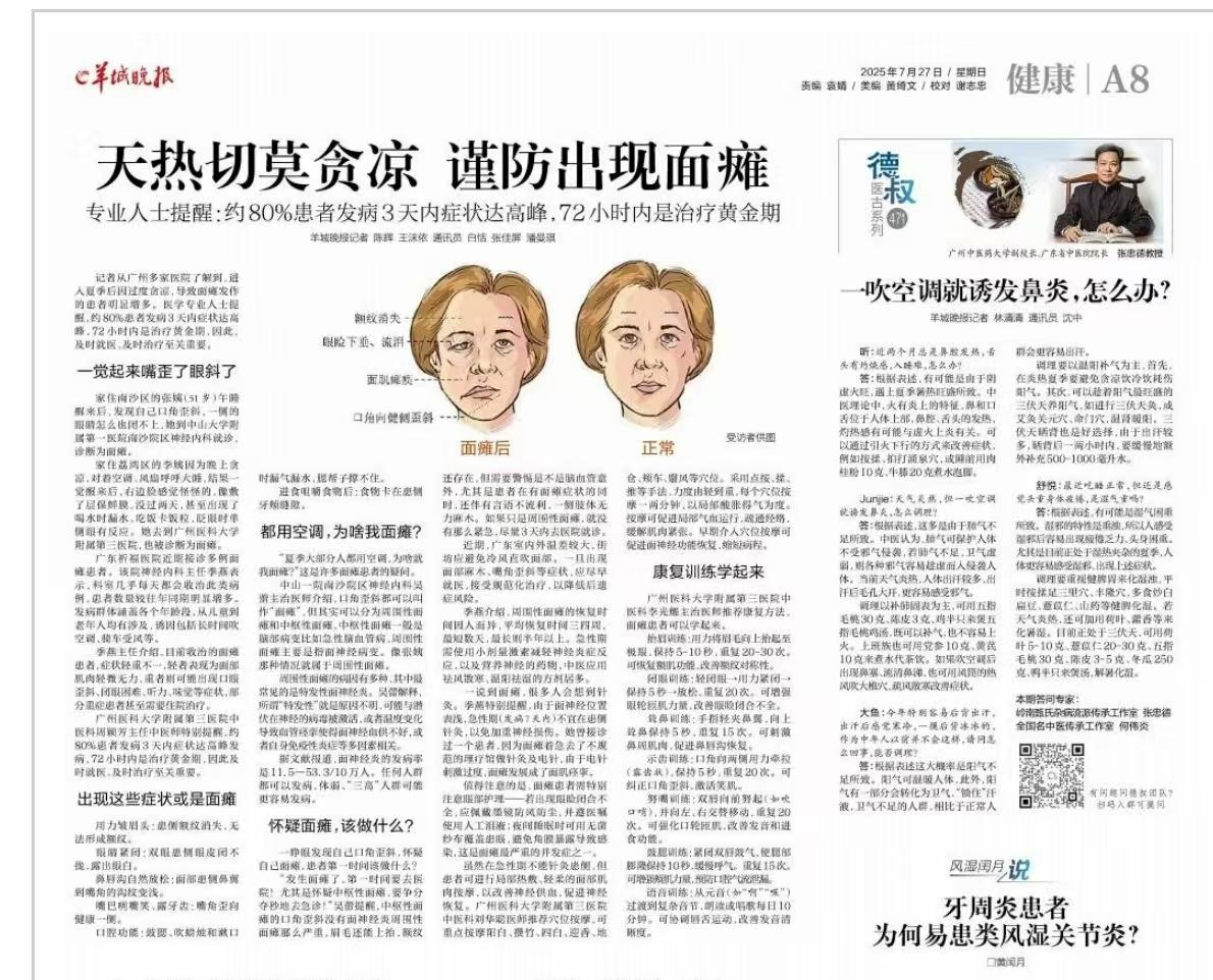 近期,广东室内外温差较大,街坊应避免冷风直吹面部。一旦出现面部麻木、嘴角歪斜等症状,应尽早就医,接受规范化治疗,以降低后遗症风险。