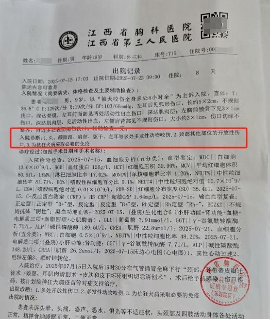 据其提供的江西省第三人民医院出院记录显示,小杰在7月15日入院,入院诊断为:1.头、颜面颈、肩部、躯干、左耳等多处多发性动物咬伤,2.颈部其他部位的开放性伤口,3.为抗狂犬病采取必要的免疫。