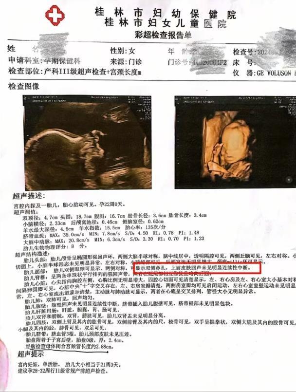当事人公布的多张彩超检查报告单显示,其于孕22周、胎儿28周4天在桂林市妇幼保健院进行检查,检查结果均显示,胎儿上唇皮肤回声未见明显连续性中断。