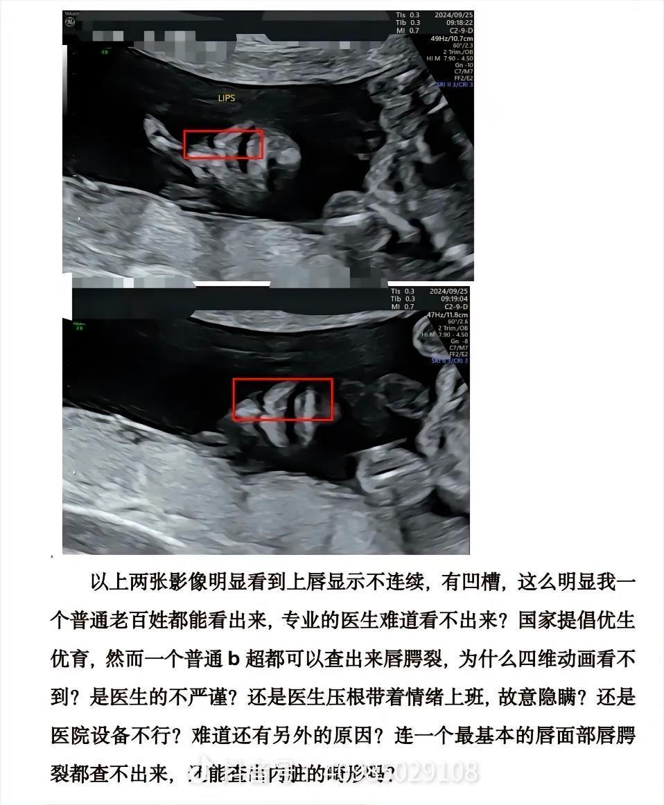 记者注意到,当事人发视频称,2024年6月26日,她在桂林市妇幼保健院建档进行孕检,整个产检过程都在该医院进行,产检显示胎儿一切正常,但孩子出生后却被诊断为先天性畸形二度唇腭裂,伴有牙槽裂等。后来其查看四维图,发现孩子嘴唇有明显的缺口,红唇不连续,但在产检过程中医院并未告知孩子存在问题。她到医院请求封存病历被拒,并投诉到卫健委,线下去提交材料时,遭卫健委工作人员怒斥。