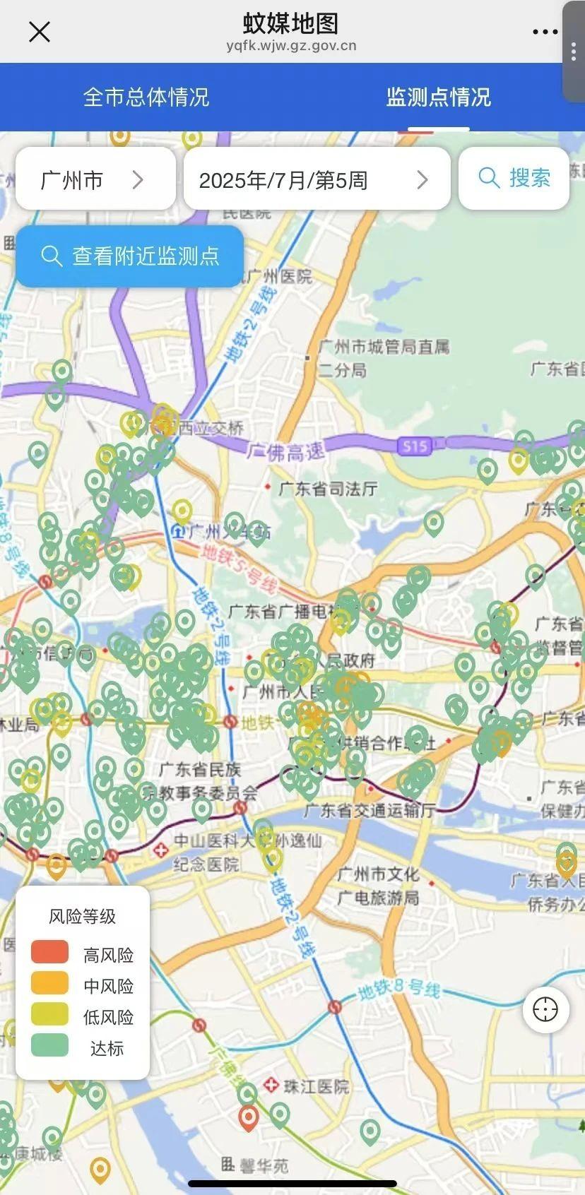 广州市蚊媒地图包括“全市总体情况”和“监测点情况”两个模块。居民可通过这个地图了解全市不同区域总体蚊媒密度水平;也可通过地图定位,精准查询其所在街镇以及周边区域蚊媒监测点的蚊媒密度情况,了解蚊媒密度变化趋势。