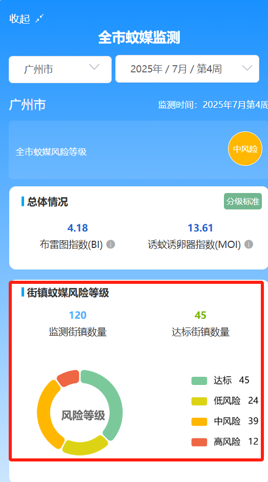 7月第4周的蚊媒监测结果显示,监测的120个街镇中,45个街镇蚊媒控制达标,蚊媒低、中、高风险的街镇分别有24个、39个、12个。