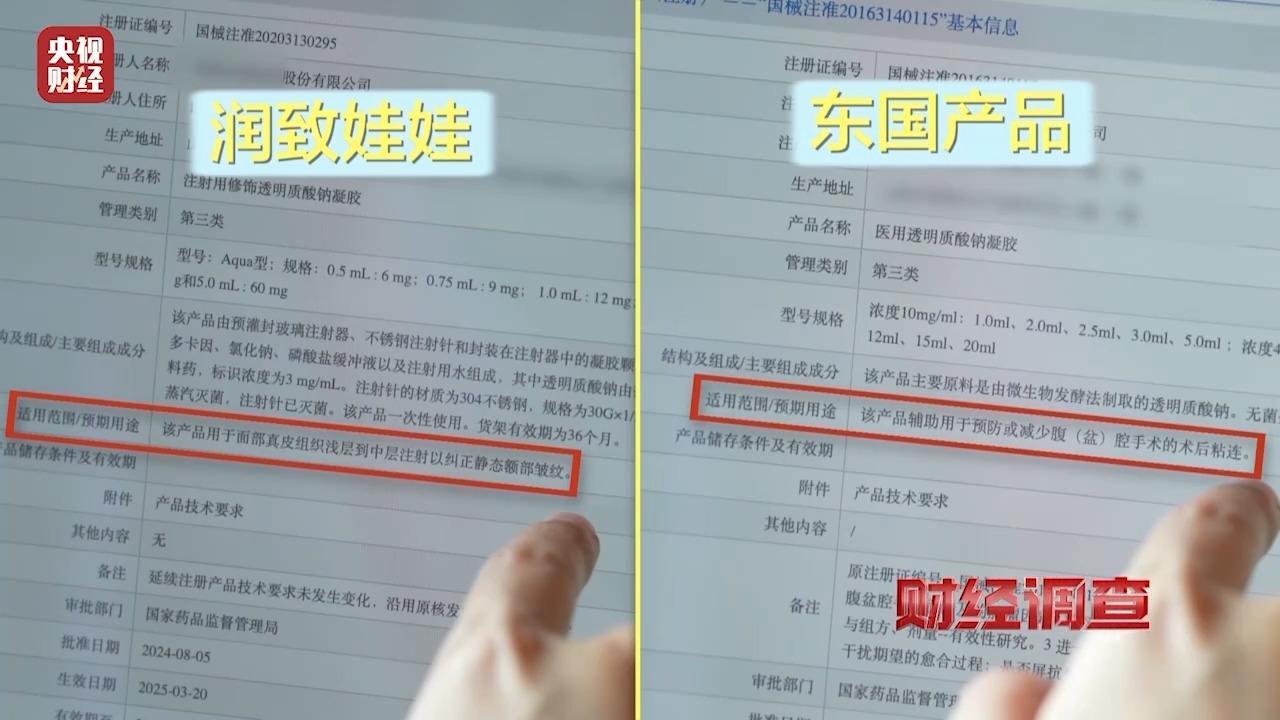 记者查询产品外包装信息后发现,东国产品的适用范围实为“预防或减少腹(盆)腔手术的术后粘连”,也就是说,这款东国透明质酸钠凝胶根本不能用于面部水光注射!