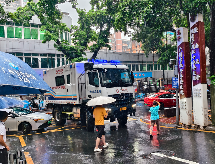 广州市红十字会医院是广州市应急医院,记者了解到,为应对本次暴雨灾害,医院派出了全省唯一具备复杂涉水路况通行能力的越野涉水救护车,可满足在台风、暴雨、水涝等恶劣环境下执行任务,在暴雨、洪水等自然灾害发生时,该救护车能够穿越积水区域迅速到达受灾现场,5G远程会诊系统可实现患者上车即入院。5日10时许,5名医务人员组成的涉水救护车组奔赴现场待命做好紧急医学救援准备,进入待命状态,随时准备应对各类突发医疗状况。