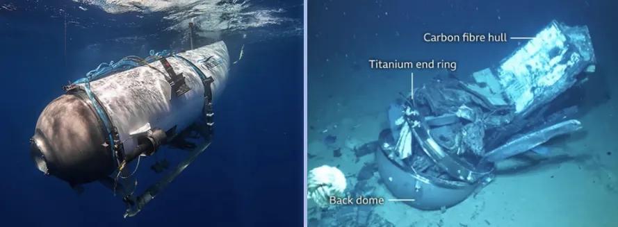 潜水器的突然内爆是由于“结构完整性”的丧失,所有乘员都承受了每平方英寸4930磅的水压,导致“瞬间死亡”。这样的压力值,相当于在一枚硬币大小的面积(1 cm²)上压着3.5头成年亚洲象,金属或复合材料在同等压力下可能瞬间崩溃。