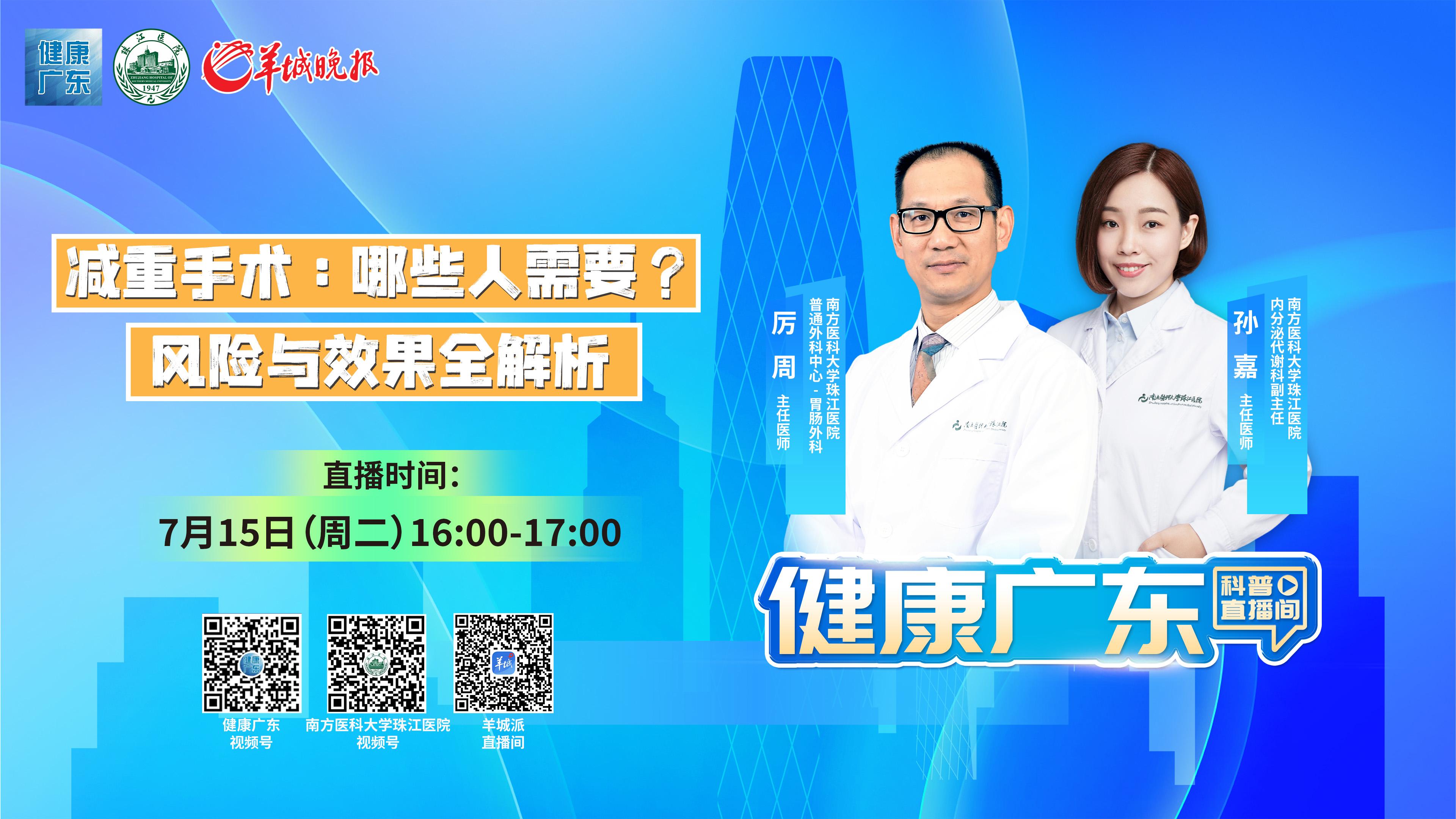 7月15日,南方医科大学珠江医院普通外科中心-胃肠外科主任医师厉周、内分泌代谢科副主任孙嘉做客直播间,聚焦的话题为“减重手术:哪些人需要?风险与效果全解析”,让我们一起了解胃肠外科如何帮助大家科学减重。