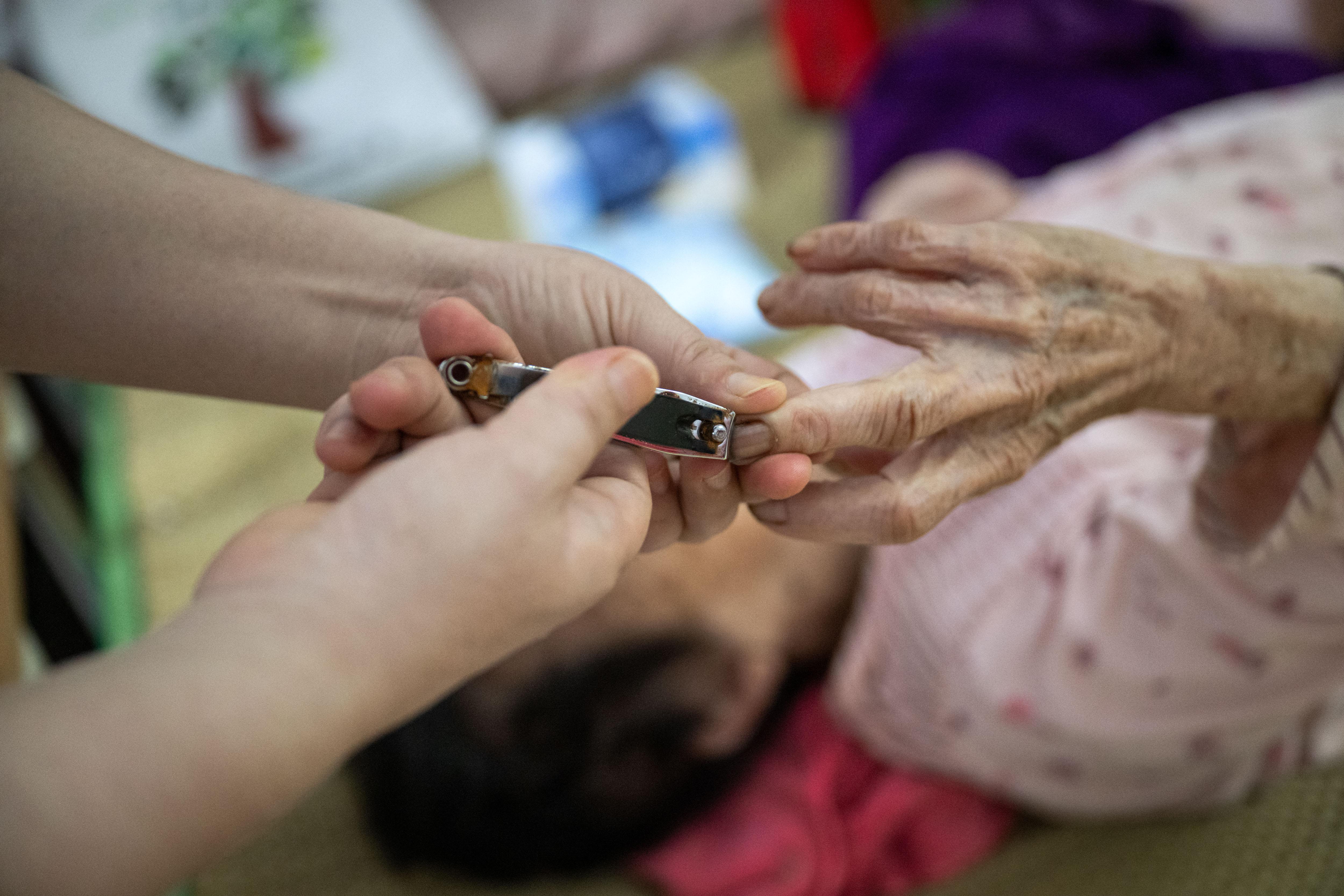 黄小青一走进房间,老人立刻来了精神:“我十分想你了,手机坏了,打不了电话。”量完血压,黄小青看到婆婆两个月没剪的长指甲,拿出随身携带的指甲刀,耐心地帮她修剪,又忙前忙后地替她擦身清理。