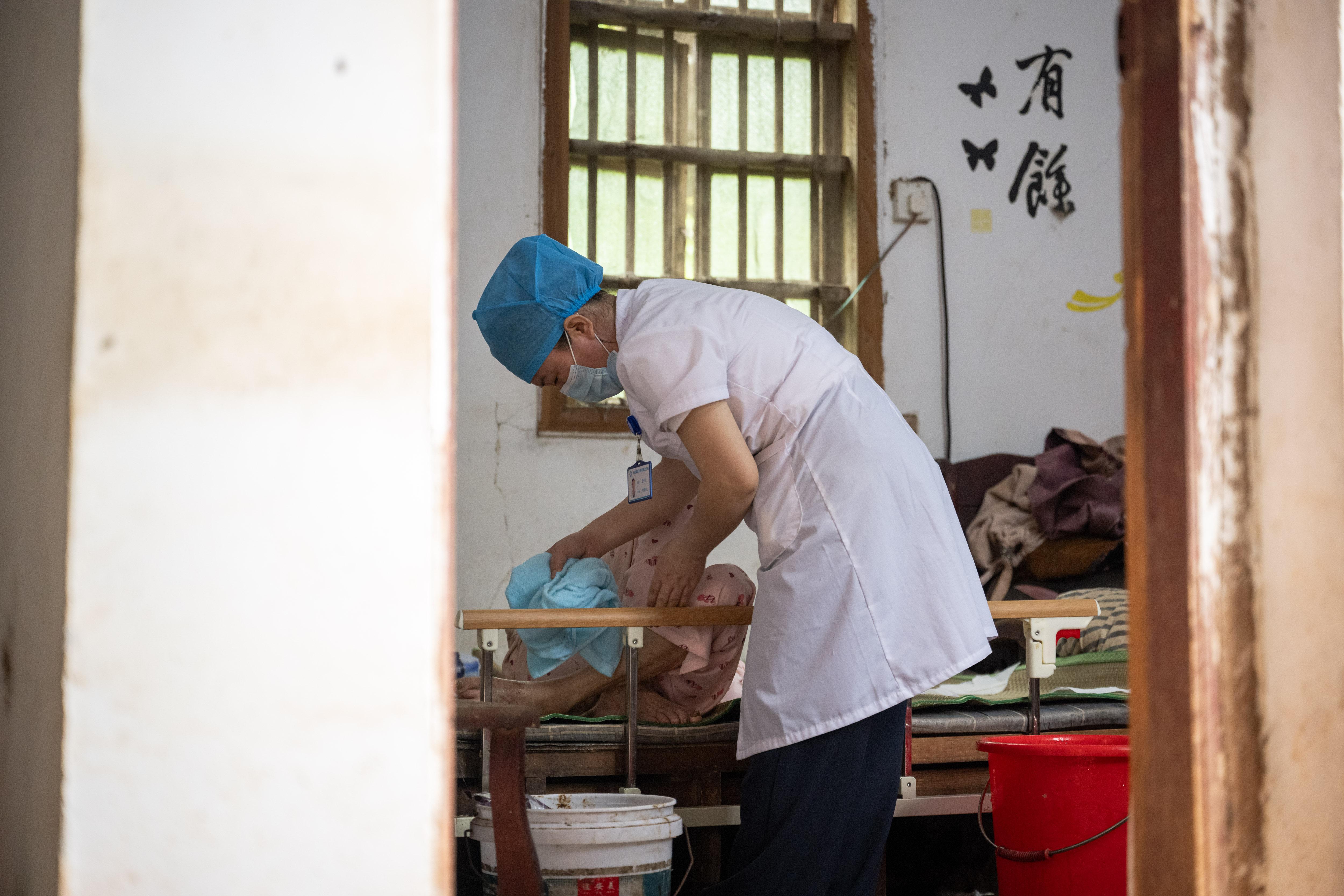 丁婆婆是一位失能老人,几年前因脑瘫接受手术,术后行走困难。由于疏于照顾,她渐渐失去了自理能力,只能终日躺在一张一米五宽的木板床上。狭小的房间里,弥漫着体味、花露水和排泄物混杂的气息。