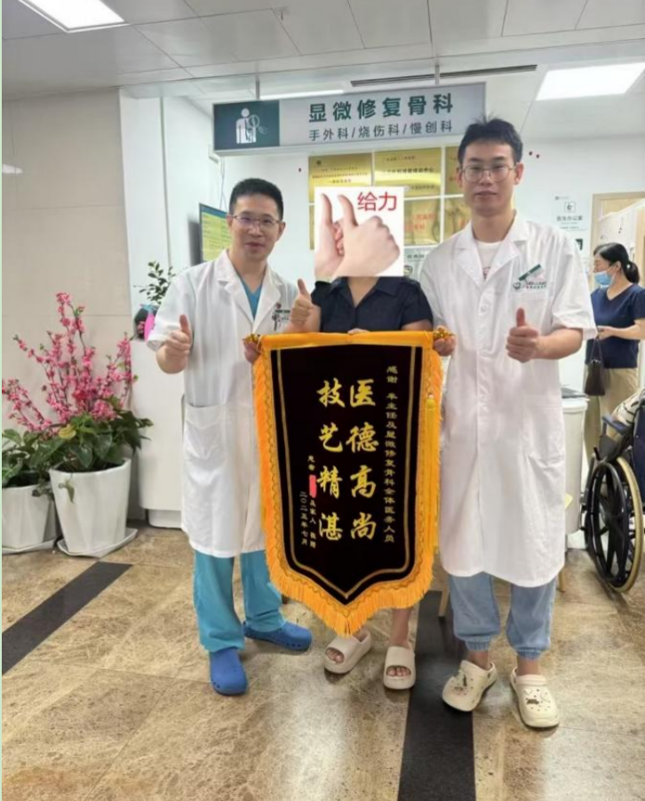 伴随着监护仪上血流通畅的提示,这场修复手术宣告成功。术后第10天,小宇一家向牟勇团队送上锦旗。