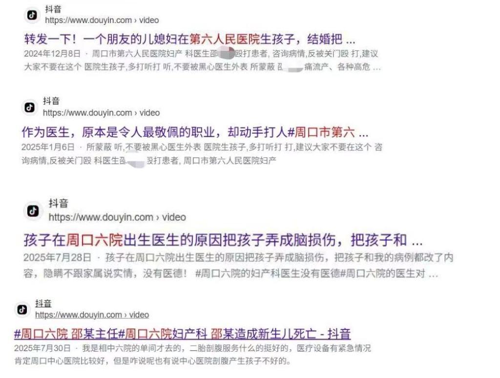 澎湃新闻记者在浏览器端口检索8月1日前的抖音信息,相关视频已下架,但能查到部分疑涉邵医生及相关医疗纠纷的视频标题和简要介绍,包括标注时间为今年1月6日的“不要被黑心医生所蒙蔽,建议大家不要在这个医院生孩子”、“周口市第六人民医院妇产科医生邵医生(编者注:原文系全名)殴打患者”。