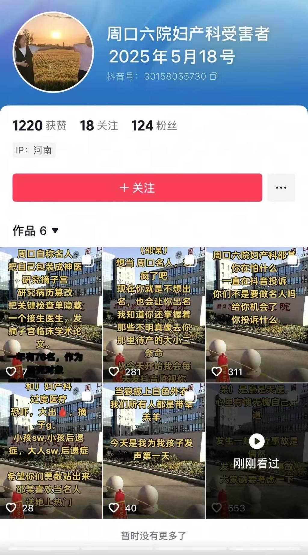 记者还注意到,有网友发布的网络截图,显示了抖音账号“周口六院妇产科受害者2025年5月18号”发布的部分言论。