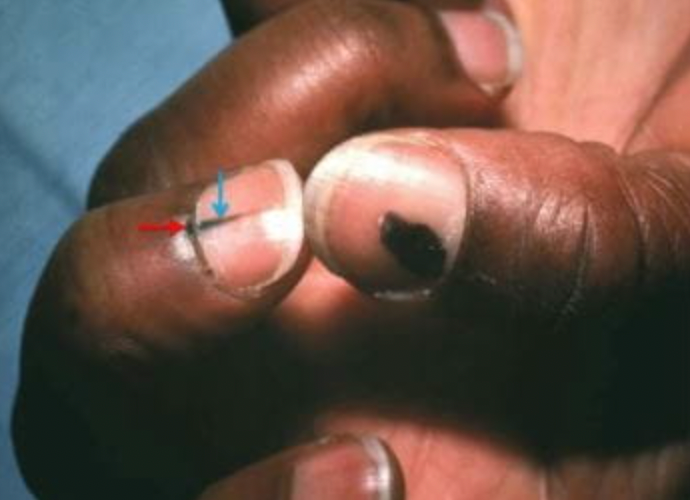 而指甲的黑色纵线从头至尾一以贯之,就说明指甲生长的原点出了问题,而且问题持续存在,导致这个结果的原因可以有很多种。