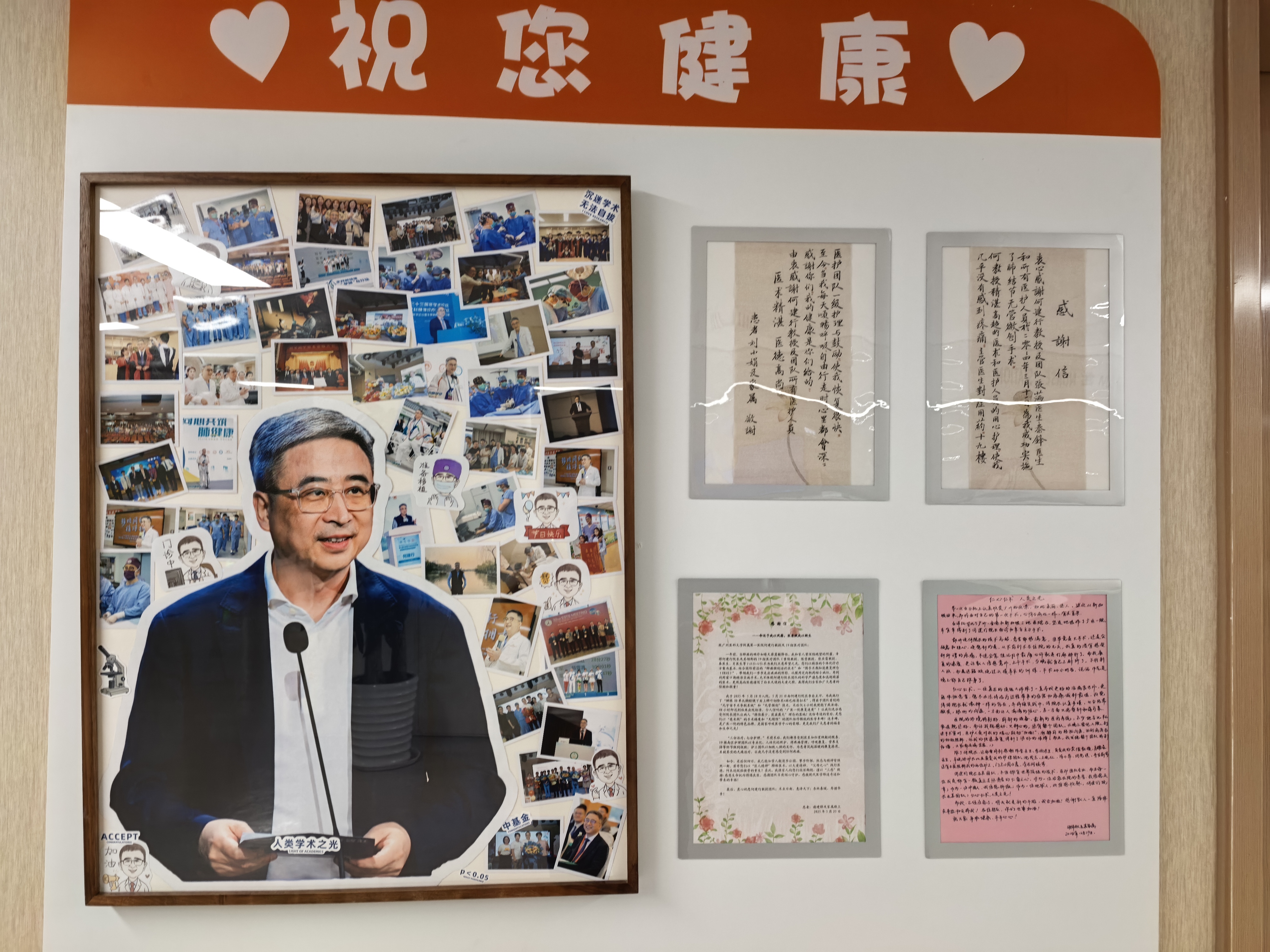 在广医一院胸外科,有一面墙上贴满了何建行与病人的合影,以及病人亲笔写下的感谢与祝福,见证着他与病人的“双向奔赴”。