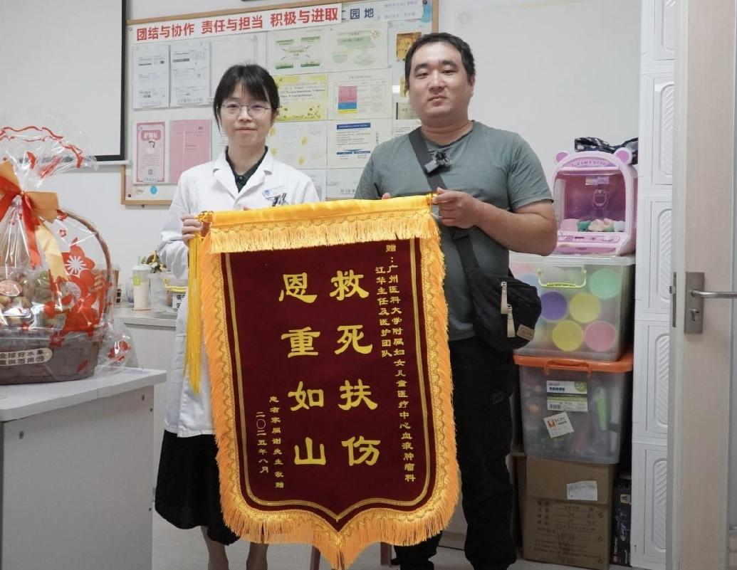 8月的广州雨水连绵,却浇不熄人间的温情。19日,外卖骑手谢先生特意调整接单时间,早早赶到广州医科大学附属妇女儿童医疗中心,将一面饱含深情的锦旗郑重交到主治医生屈钰华手中,并向江华主任团队表达深深谢意。因需在家照顾术后女儿,妻子未能前来。这面锦旗背后,是一场惊心动魄的罕见病生死救援,更彰显了医生团队以精湛医术与无疆仁心,为一个濒临绝望的家庭重新点亮希望的动人故事。