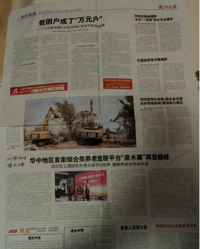 其中,《随州日报》2019年7月4日的报道《华中地区首家综合类养老旅居平台“泉水寨”再登巅峰》称,湖北泉水寨公司于2019年6月25日在上海股权托管交易中心鸣锣挂牌。时任大悟县政协副主席、民政局局长等官员出席仪式。