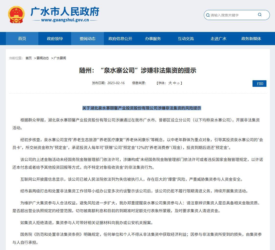 然而,就在李姐追加投资的同时,2023年2月,湖北广水市人民政府官方网站发布《关于湖北泉水寨颐馨产业投资股份有限公司涉嫌非法集资的风险提示》,提示称,经初步调查:泉水寨公司宣传“养老生态旅游”“养老医疗康复”“养老休闲康乐”等概念,以中老年群体为重点对象,引导其投资泉水寨公司的“会员卡”。