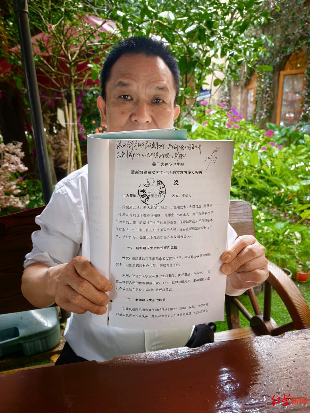 黄梨村卫生所属大井乡卫生院的下属村级医疗机构,彼时,卫生院正计划对黄梨村卫生所进行重组。卫生院与宁佰万签订的一份实施方案及协议显示,新组建的卫生所,“虽由宁佰万投资建房,购买设备及药品铺垫资金”,但性质,仍为“村办乡管”。