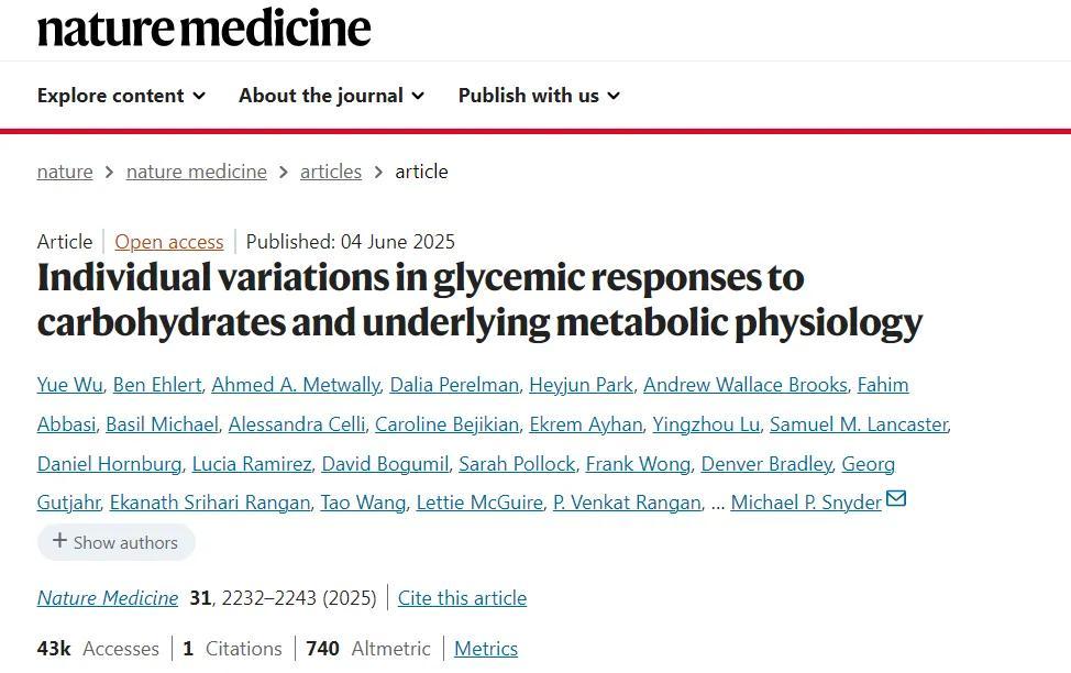这项发表在《自然·医学》杂志上的研究,纳入了55名无糖尿病史(有一半属于糖尿病前期)的受试者,让他们接受标准化膳食测试,进行连续血糖监测并记录餐后血糖反应。