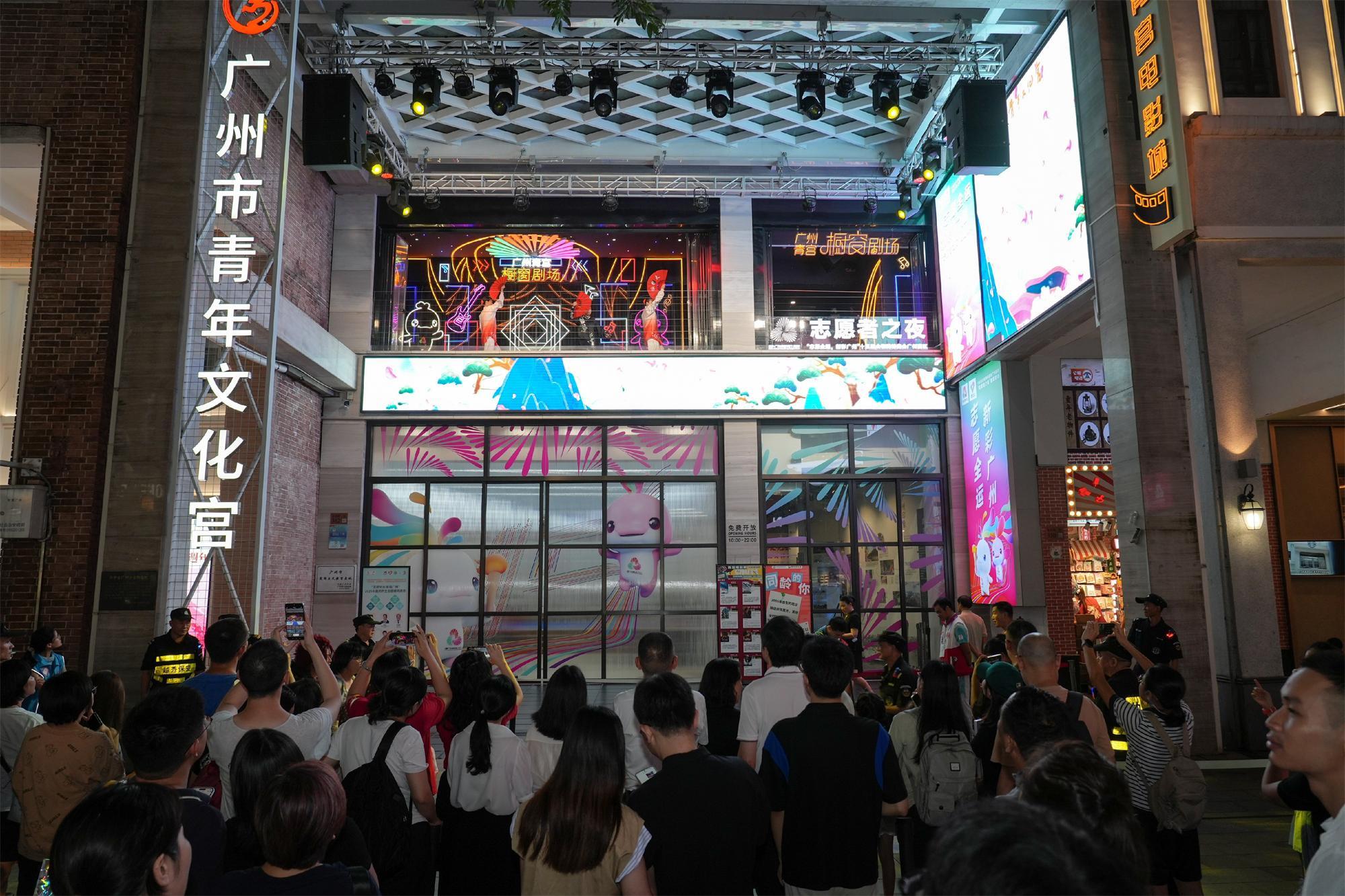 而在青年文化宫的入口处,悬在半空的橱窗剧场正进行着“志愿者之夜”的表演,从缓慢柔和的八段锦到刚柔并济的扇子舞,各类节目吸引了不少北京路上逛街的市民。广中医一院健身气功协会教练王宏秀主管护师介绍:“医武同源,希望能给市民们展示传统功法的魅力和底蕴,在全运会即将到来之际,提高大家的运动热情和健康素养。”